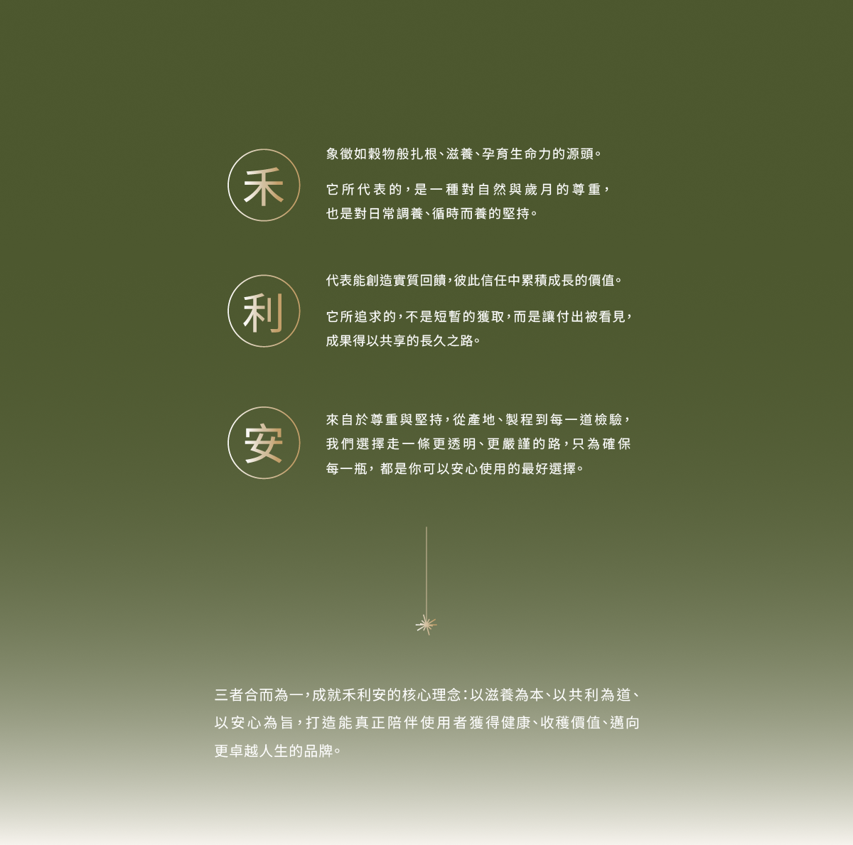 專注科研 精益求精 秉持「專注一志」的理念,禾利安與深諳宮廷秘方的大陸國醫合作, 將傳統養生配方以科學方式改良,並在台灣以嚴格標準完成檢驗與品質把關。融合現代營養科技與古法萃取精華,每一瓶產品都以高規格打造, 確保安全、健康、值得信賴。 共創平台 人人有機會 禾利安堅信,每個人都值得擁有實現理想的舞台。 透過開放透明的制度設計,讓付出能看見回報,讓有志者找到前進的方向。 這是一條以誠信為基礎的創業之路, 在追求健康的同時,也能開創屬於自己的財富與自由。 誠信經營 穩健前行 我們拒絕華而不實的口號,以透明制度與確實成果建立可靠的信任基礎。 禾利安相信,真正的成功不是短暫的光亮, 而是能帶領更多人一起走向穩健長久、共同提升的人生高度。 回饋社會 善的循環 從健康出發,回饋社會。 禾利安以行動實踐關懷,推動公益計畫,讓「分享健康」不只是理念, 更成為傳遞愛與希望的力量。